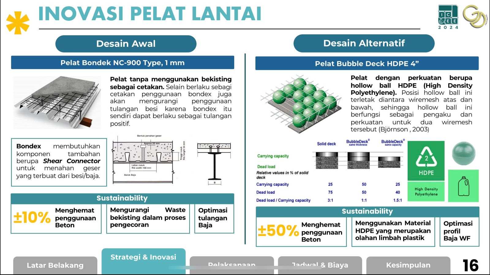 Penggunaan pelat lantai bubble deck slab menjadi salah satu keunggulan yang ditonjolkan. Bubble deck slab merupakan sistem konstruksi pelat beton pracetak yang menggunakan bola plastik berongga untuk mengurangi volume beton sehingga meringankan beban bangunan. “Selain itu, penggunaan bola plastik yang berasal dari material daur ulang High Density Polyethylene (HDPE) menjadikan rancangan tersebut lebih ramah lingkungan,” imbuhnya.