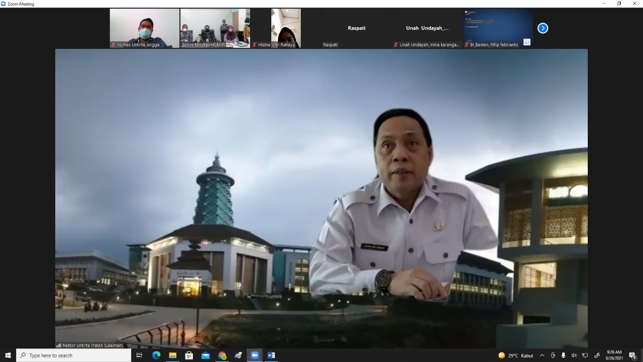 Serang, 26 Agustus 2021 Universitas Sultan Ageng Tirtayasa melaksanakan serah terima mahasiswa MBKM pada Program Matching Fund Rekacipta Kekayaan Intelektual 2021 bertempat di ruang pertemuan Dekanat Fakultas Hukum Untirta. Kegiatan diakakan secara hybrid dan dihadiri oleh Rektor Untirta Prof. Dr. Ir.H. Fatah Sulaiman, ST., MT beserta para Wakil Rektor, Kepala Dinas Perindustrian dan Perdagangan Provinsi Banten H. Babar Suharso, ST., M.Si beserta jajaran, Dekan Fakultas Hukum Untirta Dr. Agus Prihartono, SH., MH, Ketua tim Kedaireka Dr. Inge Dwisvimiar, SH., M.Hum beserta tim, serta para tamu undangan terkait.