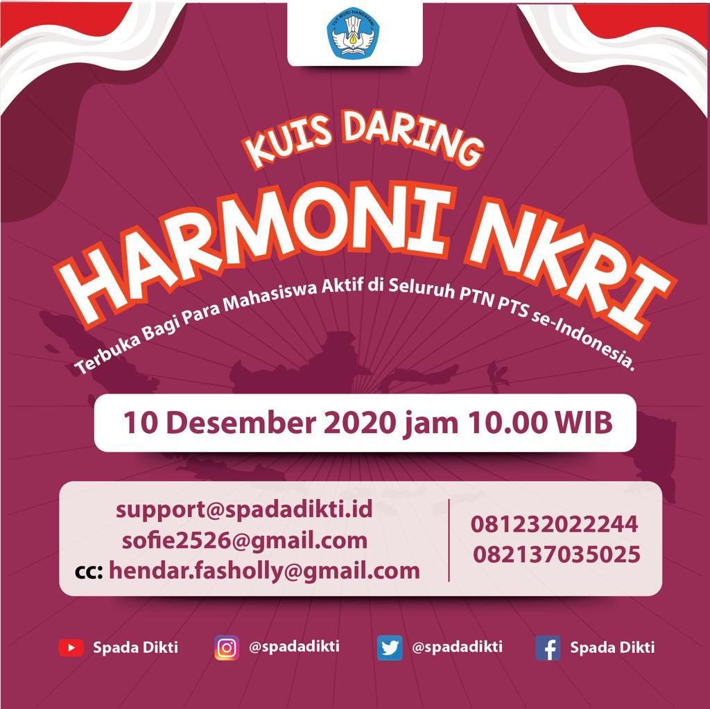 Sehubungan dengan itu, kami mohon kepada Bapak/ Ibu pimpinan perguruan tinggi di indonesia dapat ikut bemartisipasi dengan mengajak para mahasiswanya untllk mengikuti kuis danng (online) dengan tema “Harmoni NKRI”. Kuisi ini diselenggamkan dalam rangka menyelenggarakan pengujian LMS yang dikembangkan. Infonnasi lebih lanjut terkait kuis ini dapat diperoleh melalui poster yang ada pada lampiran dari surat ini. Demikian pemberitahuan ini kami sampalkan.