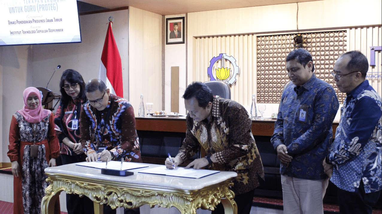 Kampus ITS, ITS News — Kesejahteraan tenaga pendidik, khususnya guru honorer, di Jawa Timur masih membutuhkan perhatian serius. Menyadari pentingnya hal tersebut, Institut Teknologi Sepuluh Nopember (ITS) bersama Dinas Pendidikan Provinsi Jawa Timur (Jatim) meluncurkan Program Terapan Ekonomi untuk Guru (Proteg) yang ditandai juga dengan penandatanganan Perjanjian Kerja Sama (PKS) di Gedung Rektorat ITS, Jumat (27/9).