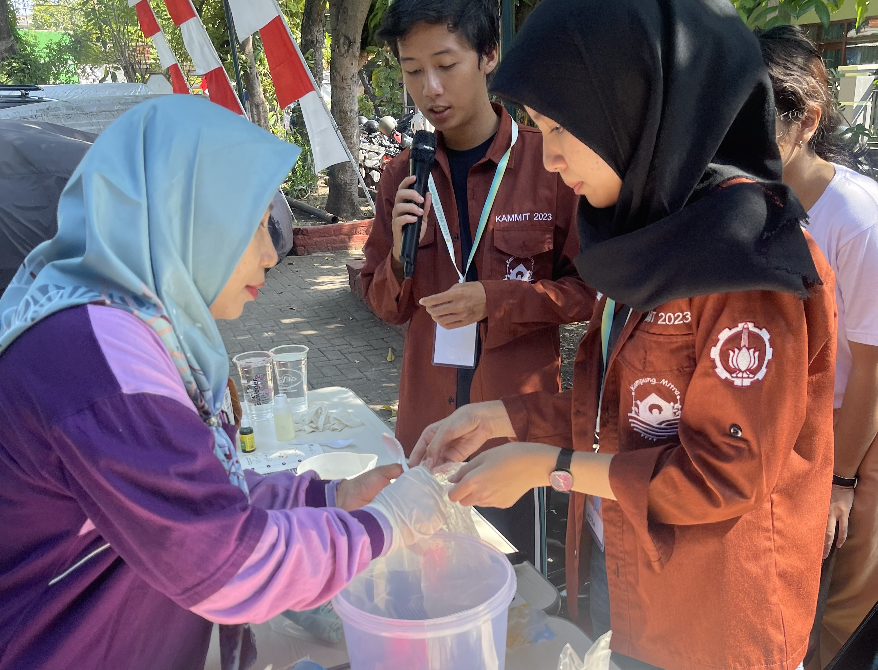 Tidak hanya membantu membuat bar screen, demonstrasi pembuatan sabun cair juga menjadi agenda dalam rangkaian kegiatan Kammit kali ini. Hal ini lantaran sabun cair menjadi salah satu media untuk mewujudkan sanitasi di masyarakat. Mantok menerangkan bahwa beberapa bahan seperti texapon, air, esens, pewarna, dan garam digunakan untuk membuat sabun cair. “Proses pembuatannya dilakukan dengan mudah,” terangnya.