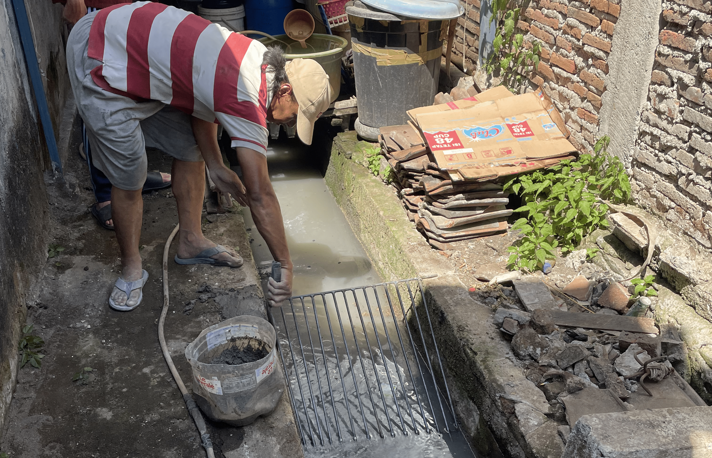 Kali ini, sejumlah tiga buah bar screen yang ukurannya menyesuaikan dimensi masing-masing saluran dipasang. Misalnya saja bar screen yang dipasang pada saluran drainase Rukun Tetangga (RT) 2 dengan lebar 60 sentimeter dengan panjang 55 sentimeter dan kemiringan 60 derajat. Adapun bar screen dibuat menggunakan baja ulir berdiameter 10 milimeter. “Sementara bar screen lainnya dipasang pada saluran drainase RT 1 dan saluran buangan ke sungai,” tuturnya.