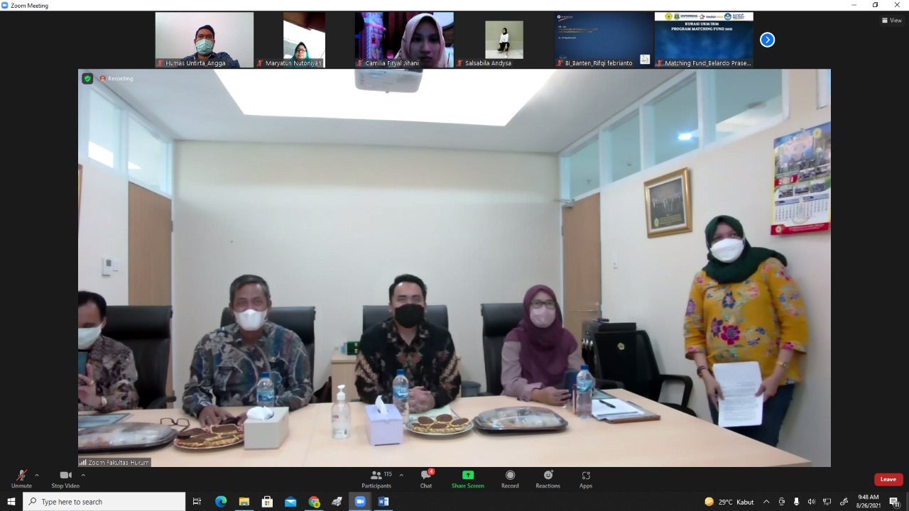 Serang, 26 Agustus 2021 Universitas Sultan Ageng Tirtayasa melaksanakan serah terima mahasiswa MBKM pada Program Matching Fund Rekacipta Kekayaan Intelektual 2021 bertempat di ruang pertemuan Dekanat Fakultas Hukum Untirta. Kegiatan diakakan secara hybrid dan dihadiri oleh Rektor Untirta Prof. Dr. Ir.H. Fatah Sulaiman, ST., MT beserta para Wakil Rektor, Kepala Dinas Perindustrian dan Perdagangan Provinsi Banten H. Babar Suharso, ST., M.Si beserta jajaran, Dekan Fakultas Hukum Untirta Dr. Agus Prihartono, SH., MH, Ketua tim Kedaireka Dr. Inge Dwisvimiar, SH., M.Hum beserta tim, serta para tamu undangan terkait.