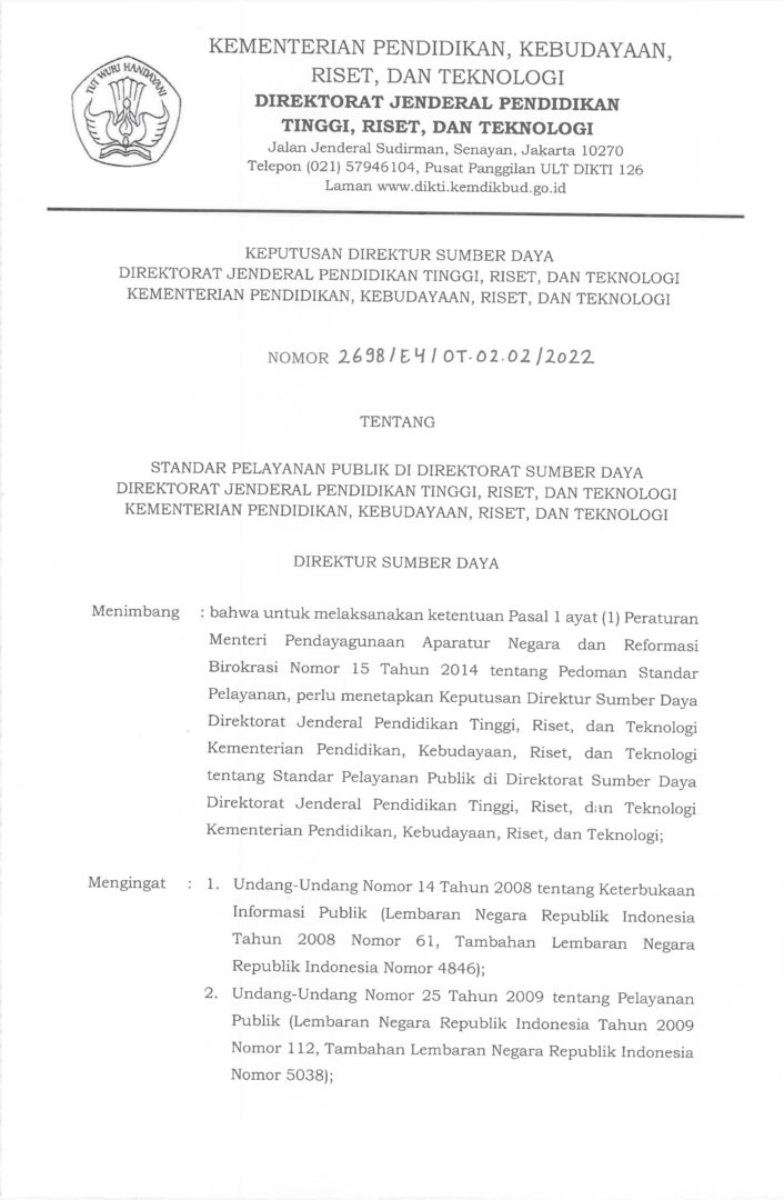 Direktorat Sumber Daya sebagai salah satu satuan kerja di Direktorat Jenderal Pendidikan Tinggi, Riset, dan Teknologi yang merupakan satuan kerja di lingkungan Kementerian Pendidikan, Kebudayaan, Riset, dan Teknologi memiliki visi yang mengacu pada VISI dan MISI Kementerian Pendidikan, Kebudayaan, Riset, dan Teknologi Tahun 2020 – 2024 yaitu: