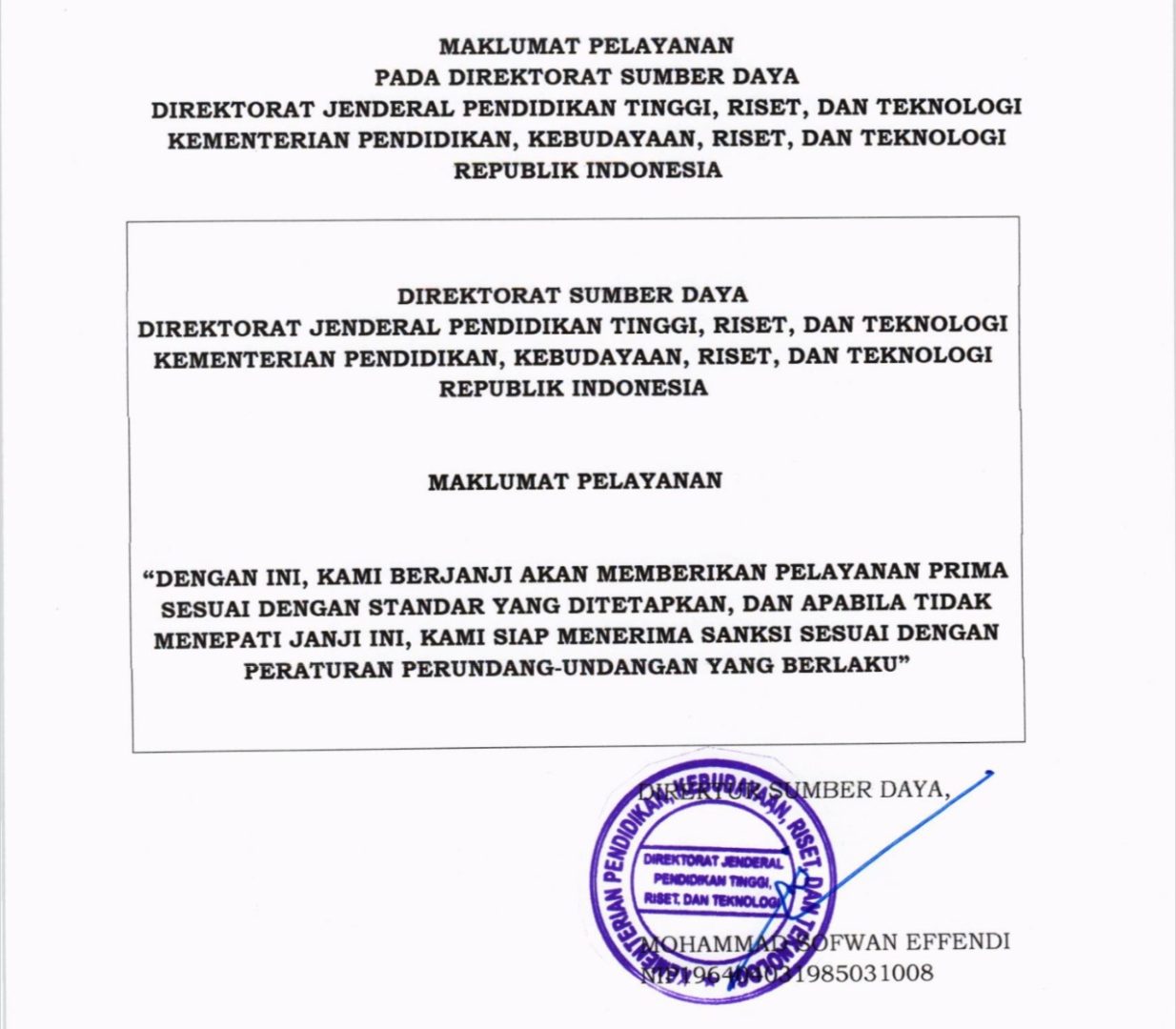 Sebagai bentuk partisipasi Direktorat Sumber Daya dalam menjaga dan meningkatkan integritas layanan secara berkelanjutan, kami mencanangkan pembangunan Zona Integritas pada tanggal 17 Maret 2022 menuju WBK/WBBM dengan harapan seluruh jajaran pegawai Dikdaya senantiasa memperbaiki dan menyempurnakan layanan yang berkonstribusi langsung pada peningkatan kualitas sumber daya manusia dan kinerja organisasi perguruan tinggi agar para pemangku kepentingan yang membutuhkan dapat terlayani dengan baik. Untuk meningkatkan layanan kepada para pemangku kepentingan, Direktorat Sumber Daya melaksanakan Forum Konsultasi Publik (FKP) pada tanggal 14 September 2022. Melalui Forum Konsultasi Publik ini, stakeholder difasilitasi untuk berkomunikasi dua arah, dimana stakeholder dapat mengusulkan, memberikan masukan dan saran kepada penyelenggara pelayanan publik atas layanan yang diterima selaku pengguna layanan. Hasil dari pertemuan dua arah ini diharapkan mampu menyelaraskan kemampuan Direktorat Sumber Daya selaku penyelenggara layanan dengan permintaan publik, atau meminimalisir dampak kebijakan yang dapat merugikan publik. Juga, mendukung pembangunan Zona Integritas menuju WBK/WBBM yang sedang dilaksanakan oleh Direktorat Sumber Daya.