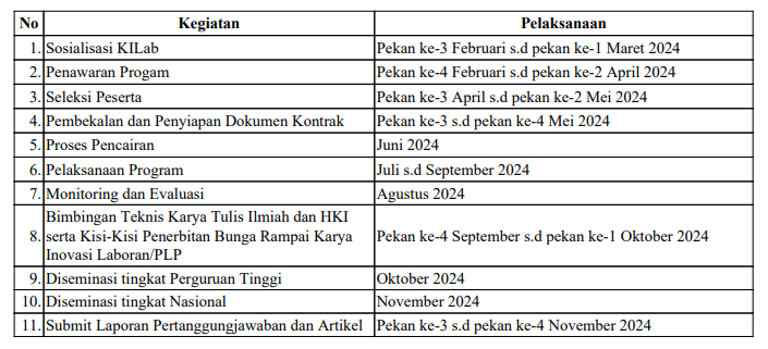 Dalam rangka pembinaan dan pengembangan inovasi Pranata Laboratorium Pendidikan (PLP) dan Laboran, Direktorat Sumber Daya meluncurkan Program Karya Inovasi Laboran (KILab) bagi PLP dan Laboran di Perguruan Tinggi. Adapun tahapan pelaksanaan Program KILab sebagai berikut: