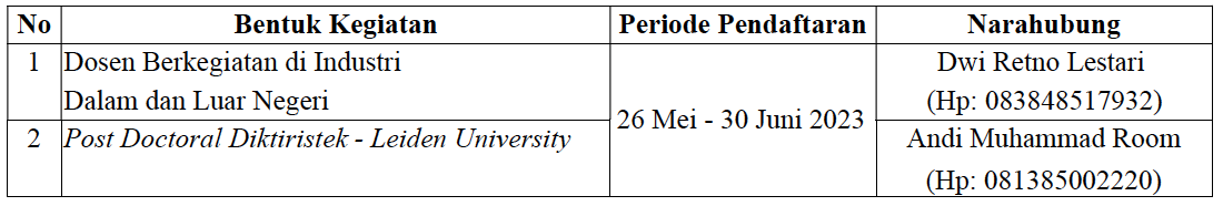 Menindaklanjuti surat Direktur Sumber Daya Nomor 1304/E4/DT.04.03/2023 tanggal 1 April 2023 tentang Penawaran Program Peningkatan Kompetensi Dosen dan Tenaga Pendidik Tahun 2023, Direktorat Sumber Daya, Ditjen Diktiristek berkolaborasi dengan Lembaga Pengelola Dana Pendidikan (LPDP) kembali menawarkan Program Peningkatan Kompetensi Dosen yang lain sebagai berikut:
