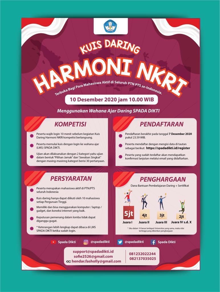 Sehubungan dengan itu, kami mohon kepada Bapak/ Ibu pimpinan perguruan tinggi di indonesia dapat ikut bemartisipasi dengan mengajak para mahasiswanya untllk mengikuti kuis danng (online) dengan tema “Harmoni NKRI”. Kuisi ini diselenggamkan dalam rangka menyelenggarakan pengujian LMS yang dikembangkan. Infonnasi lebih lanjut terkait kuis ini dapat diperoleh melalui poster yang ada pada lampiran dari surat ini. Demikian pemberitahuan ini kami sampalkan.